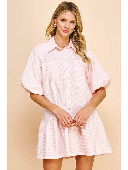 LINEN STRIPED RUFFLE SLEEVE BACK BOW MINI DRESS