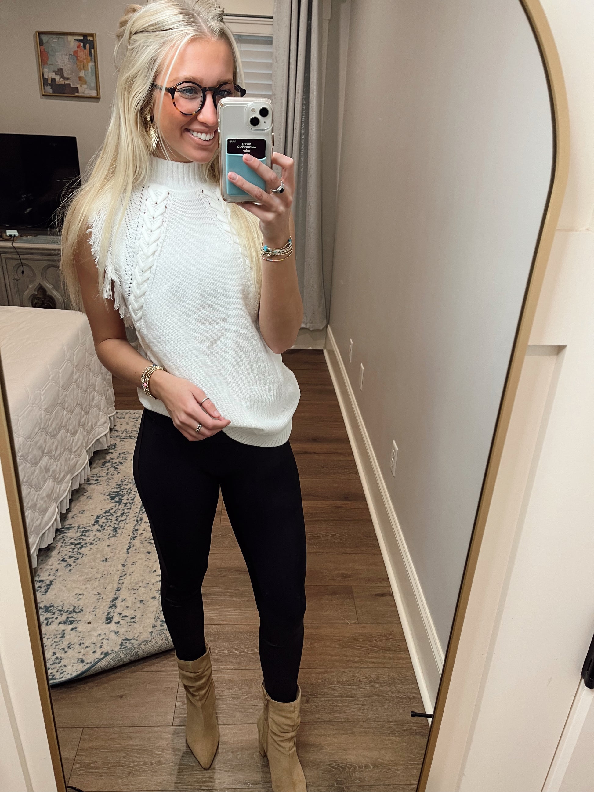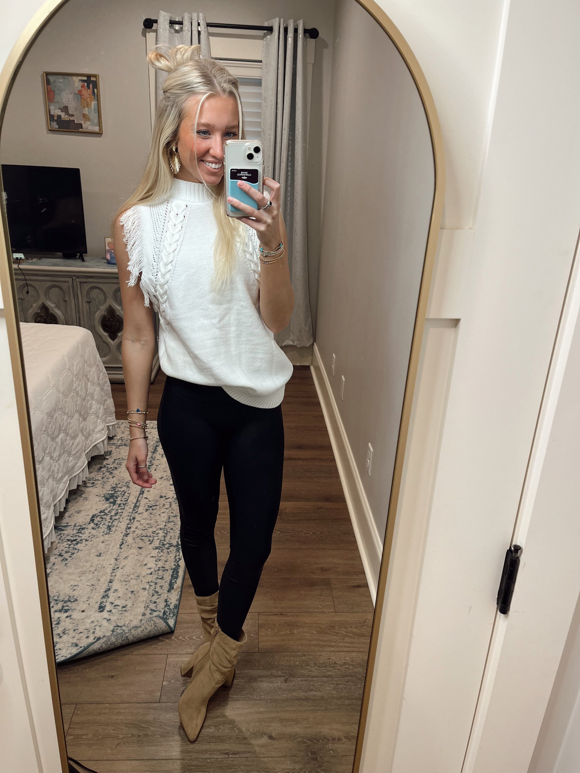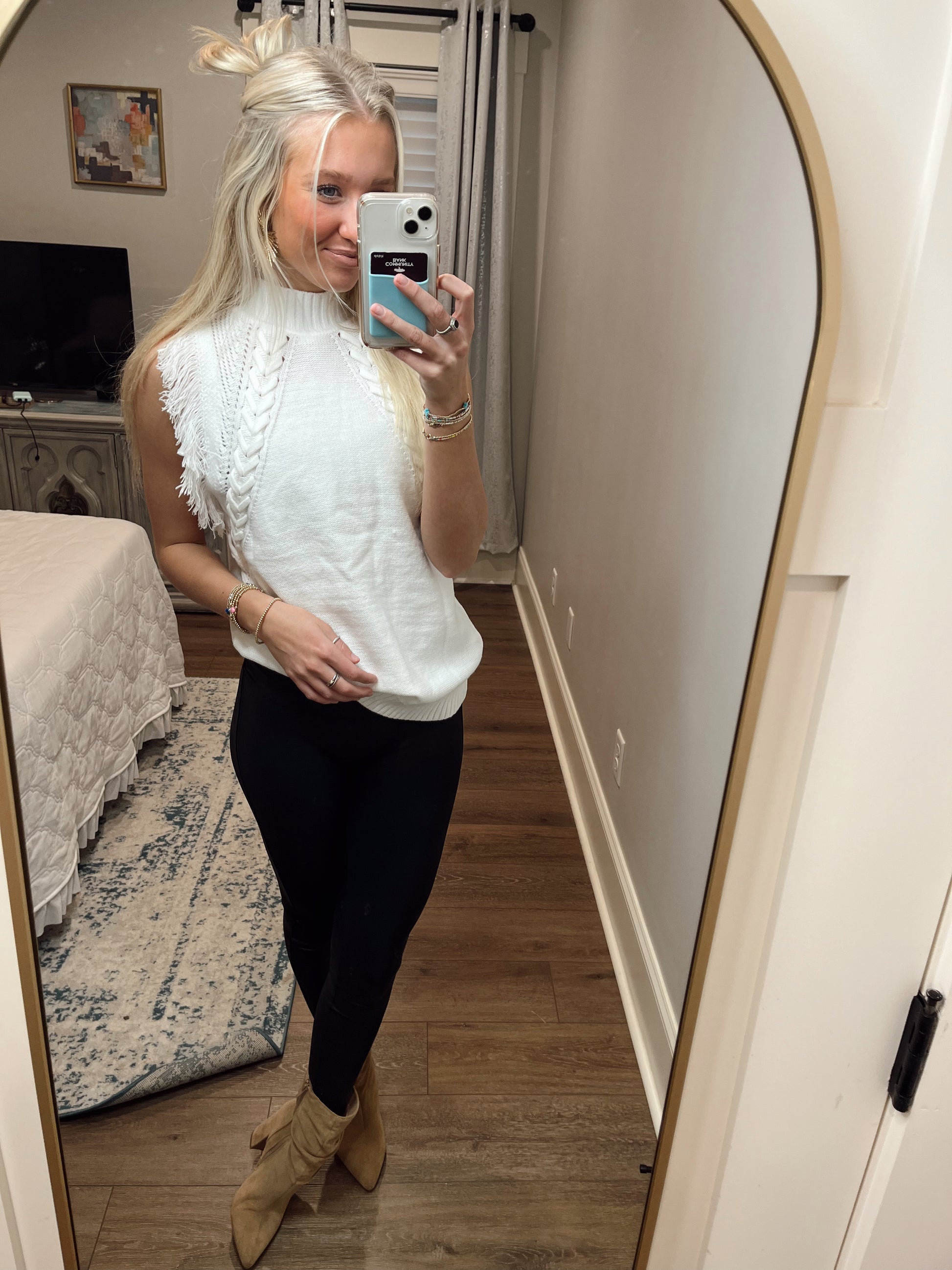 Introducing our Fringe Mock Neck Sweater - Sleeveless Edition! This adorable wardrobe essential combines cozy comfort with a touch of whimsy. The mock neck adds a hint of sophistication, while the sleeveless design allows for easy layering or a carefree, stylish look on its own. Adorned with playful fringe details, this sweater brings a dash of charm to your outfit, making it perfect for both casual outings and cozy evenings by the fireplace. Embrace warmth and cuteness with this must-have sleeveless Fringe Mock Neck Sweater!