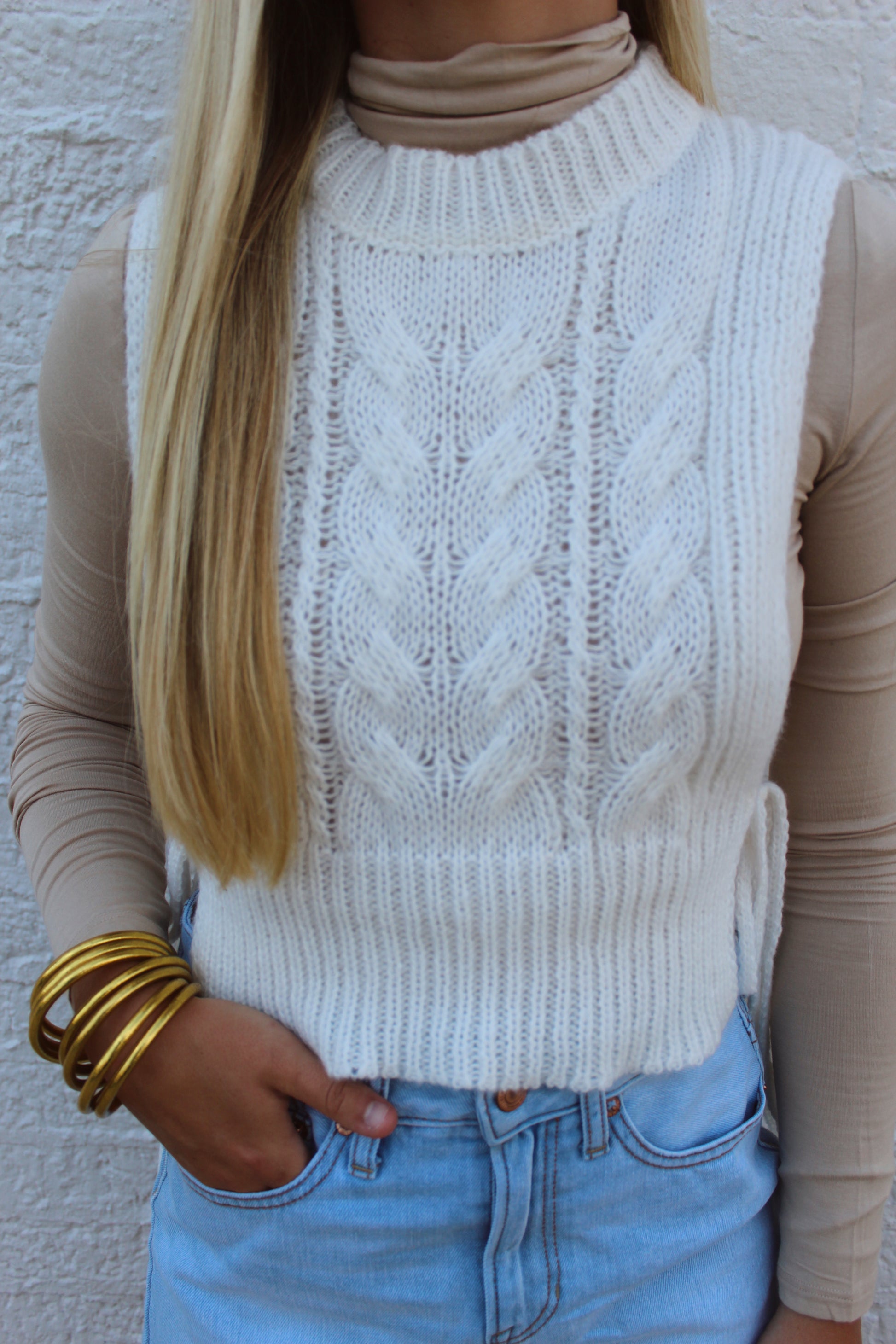 This side tie sweater vest is a stylish and versatile addition to your wardrobe. Featuring a sleeveless design with intricate knit patterns, it provides a chic and modern look. The side ties add a unique touch and allow for a customizable fit. Perfect for layering over tanks or long-sleeve shirts, this vest is ideal for transitional weather.