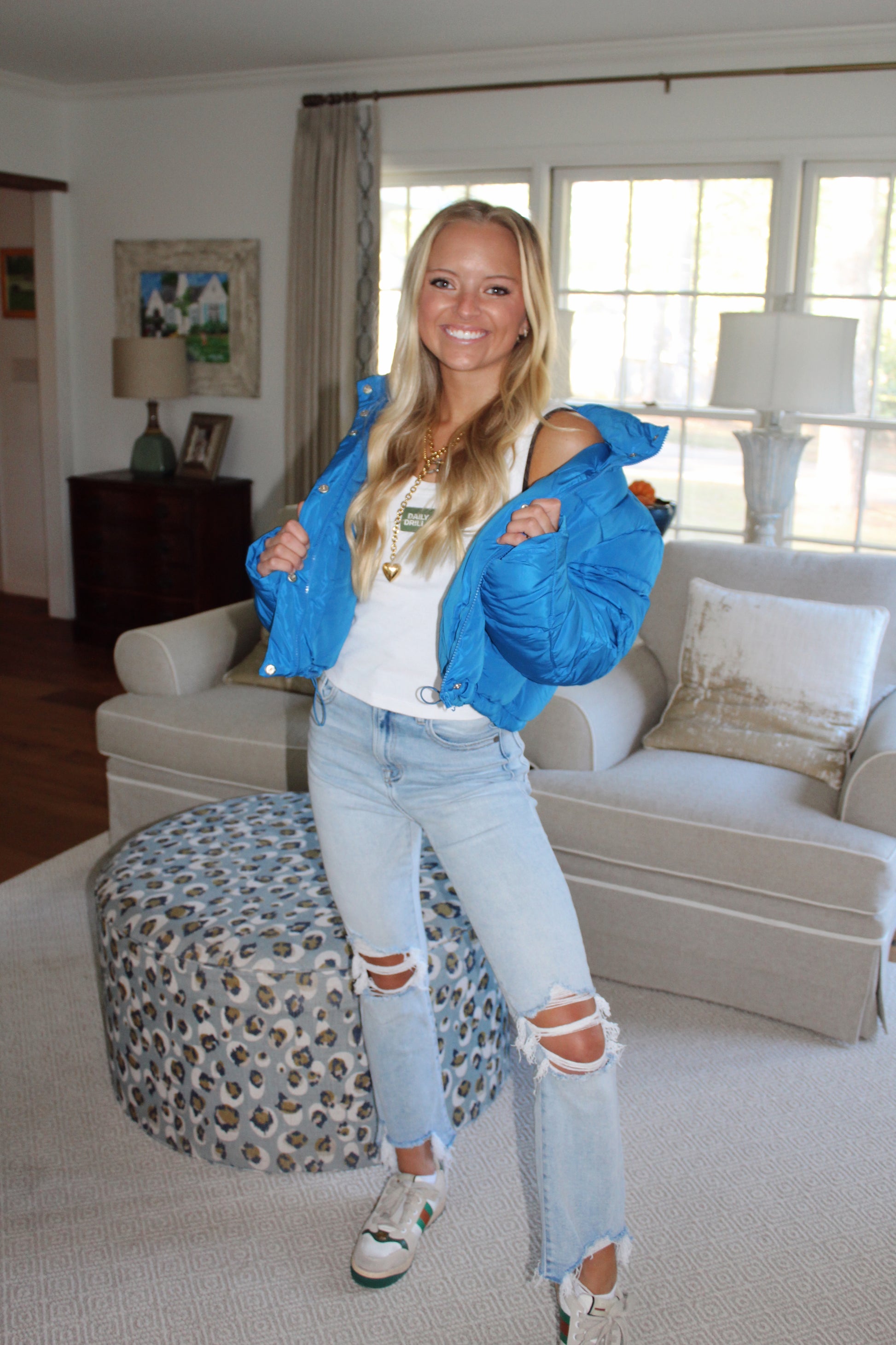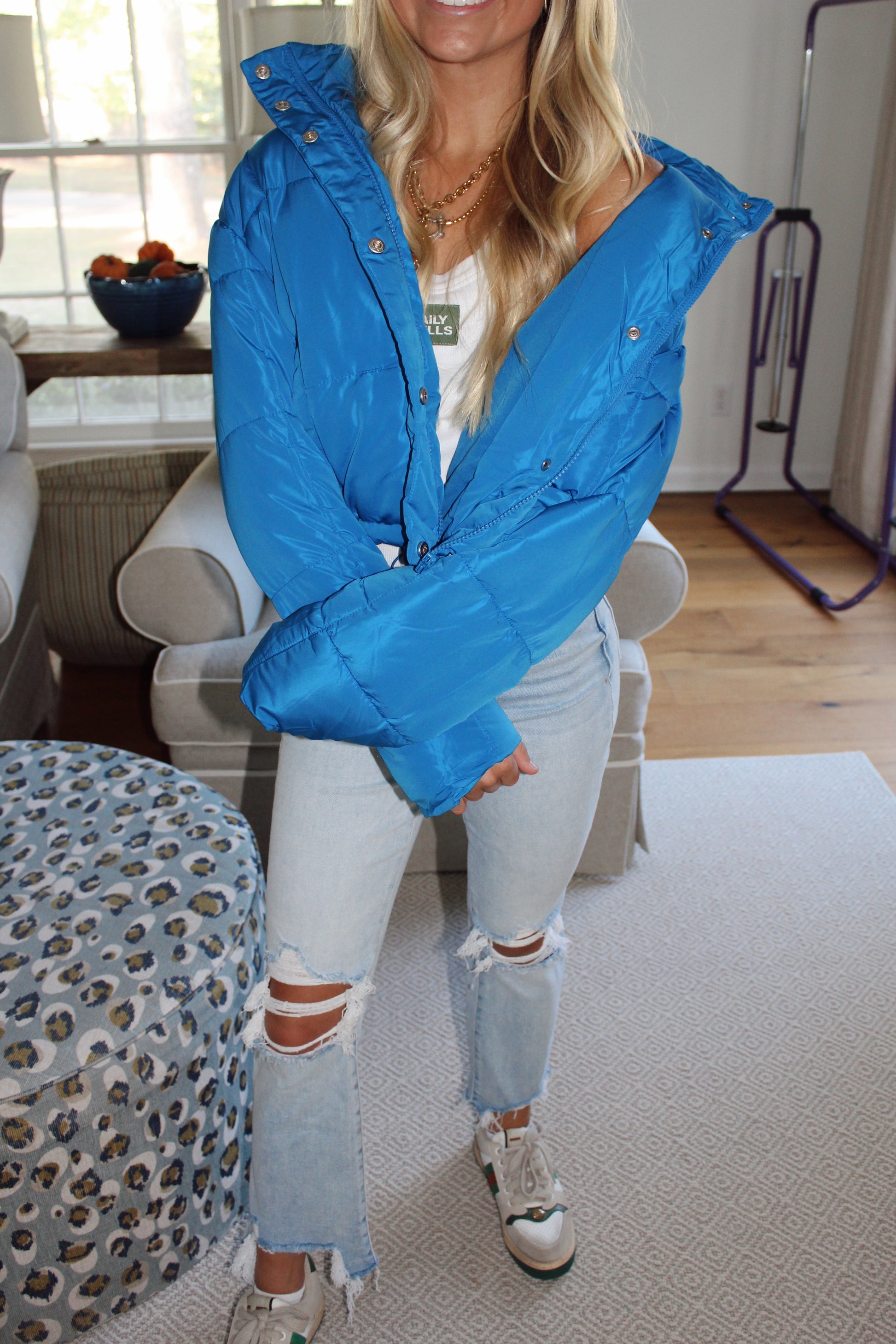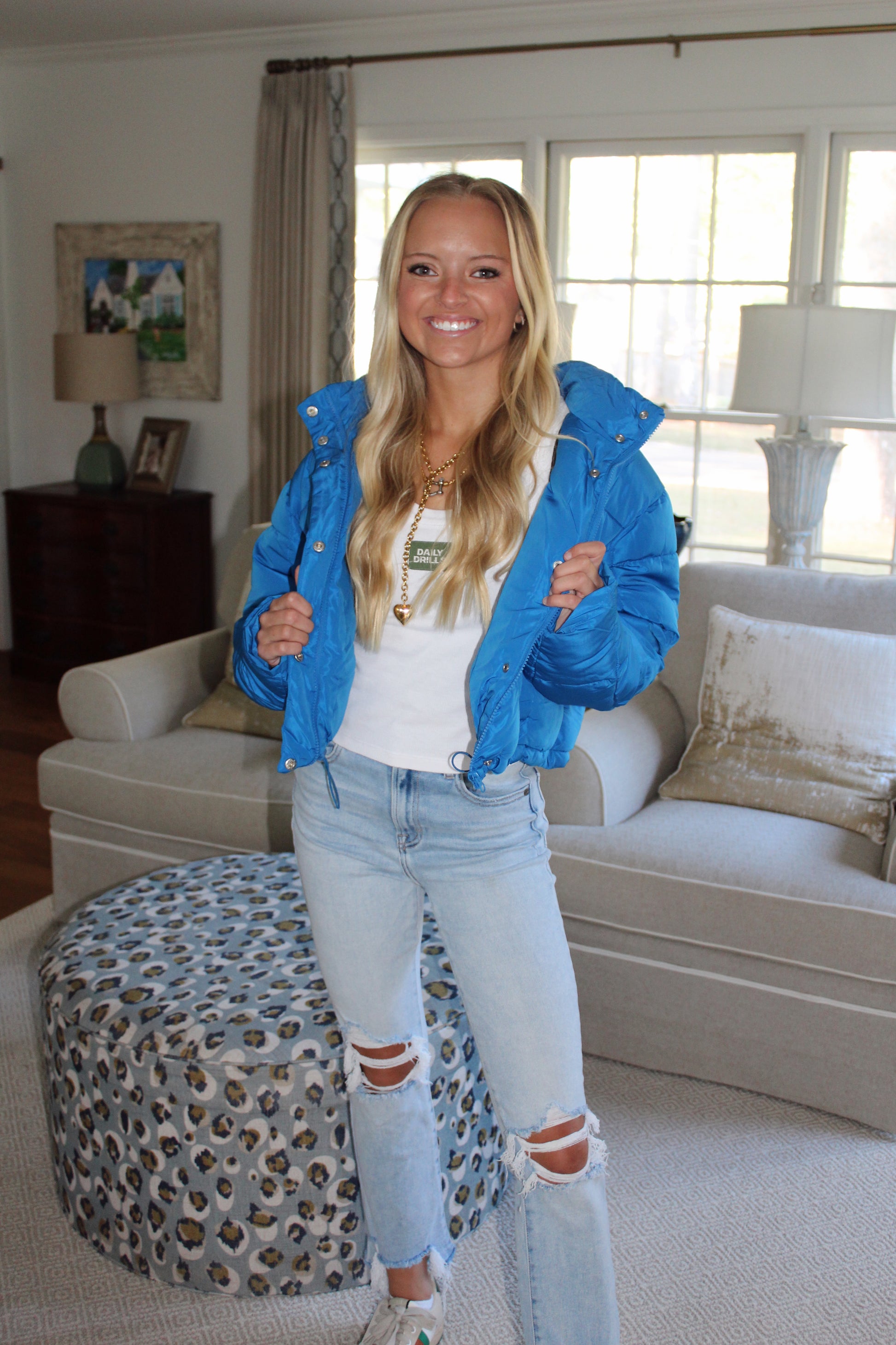 Model is 5'5 wearing a size small! This jacket is perfect for cooler weather, not too thick but not too thin!