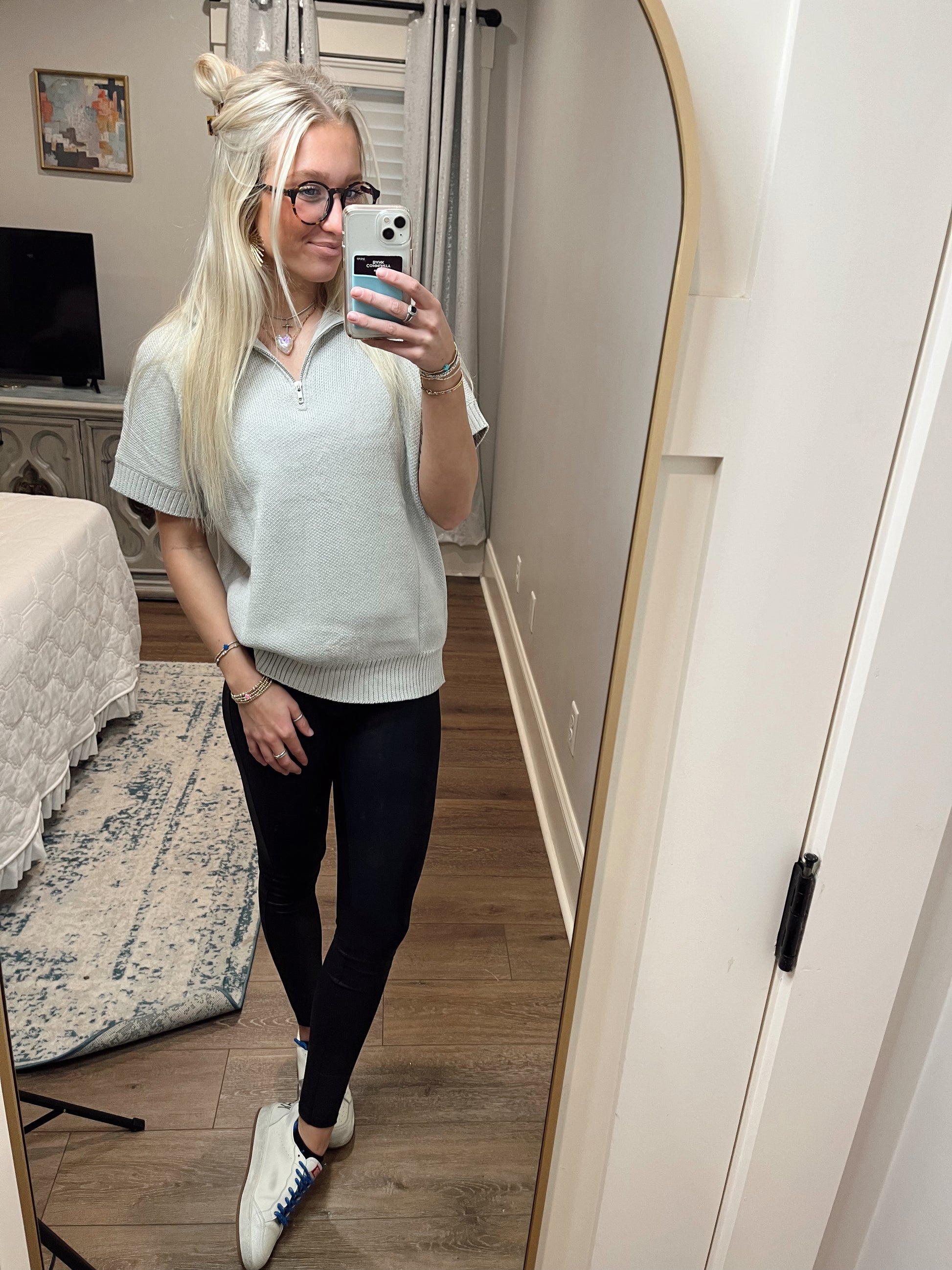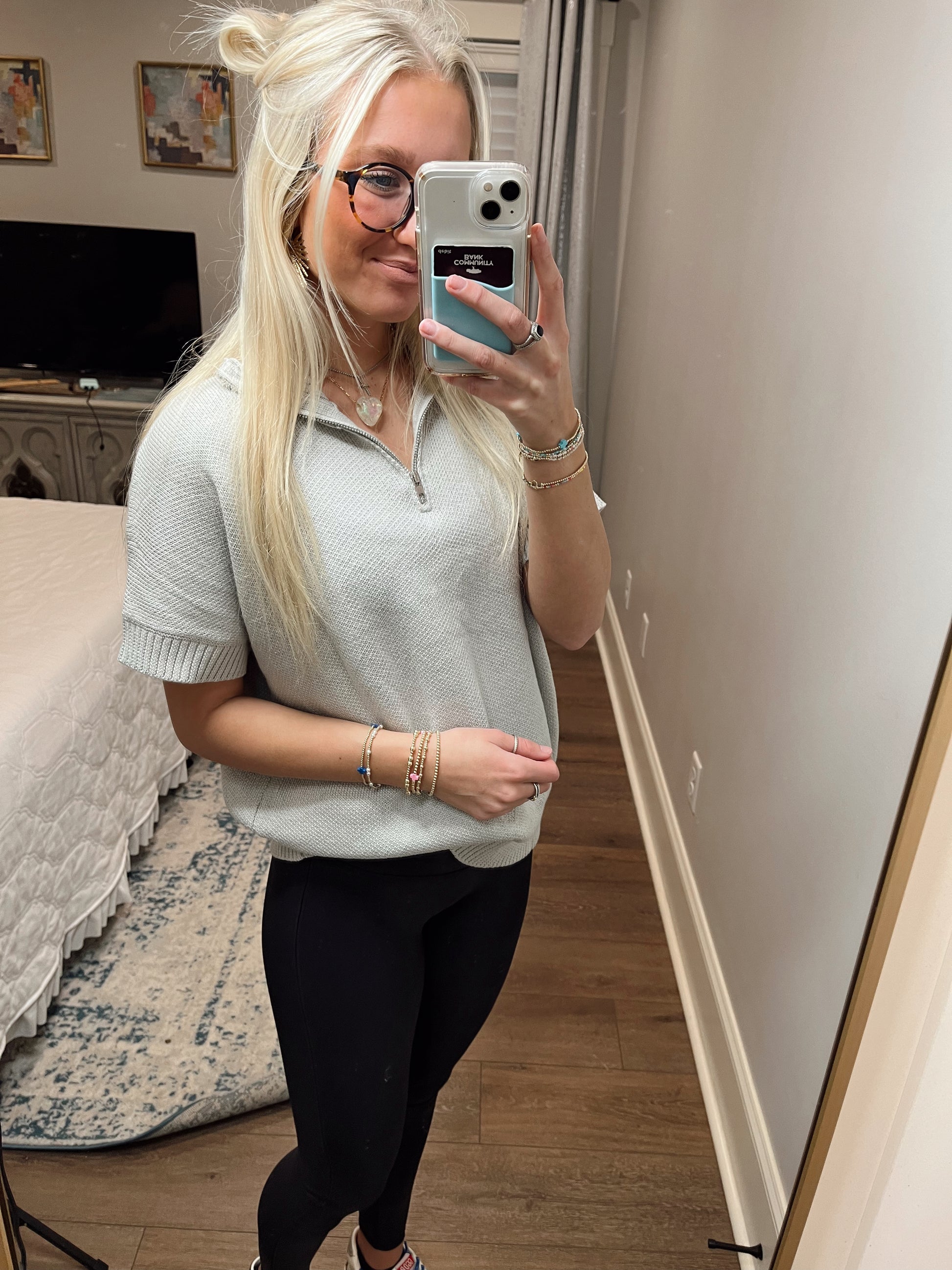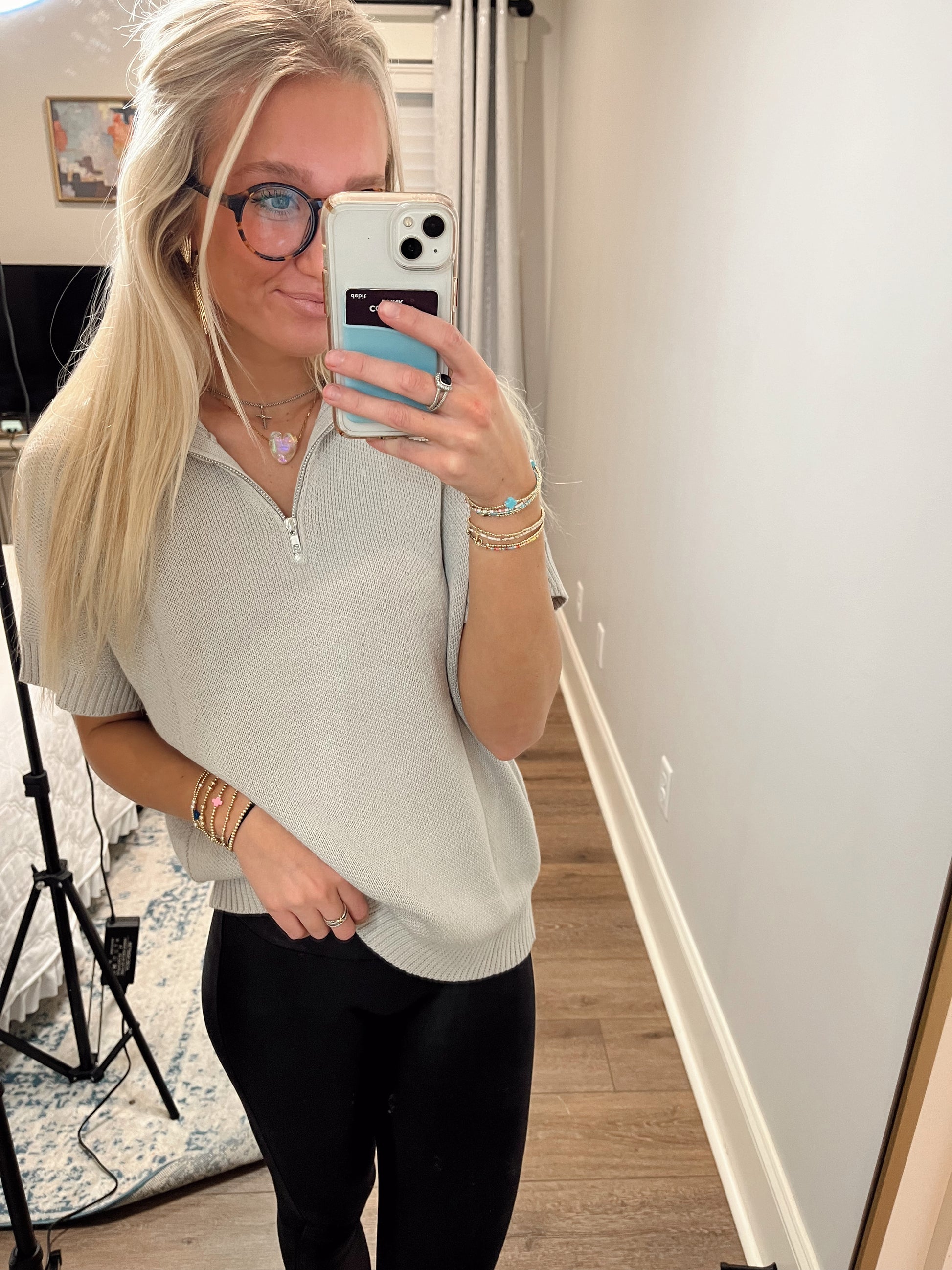 Introducing our versatile Quarter Zip Sleeveless Sweater – the perfect blend of style and comfort! This adorable sleeveless wonder is your go-to wardrobe essential, effortlessly transitioning from casual to chic with a simple zip. Whether you're dressing up for a cozy brunch or keeping it casual on a crisp evening stroll, this sweater has you covered. Its sleek quarter zip adds a touch of modern flair, making it a trendy choice for any occasion.