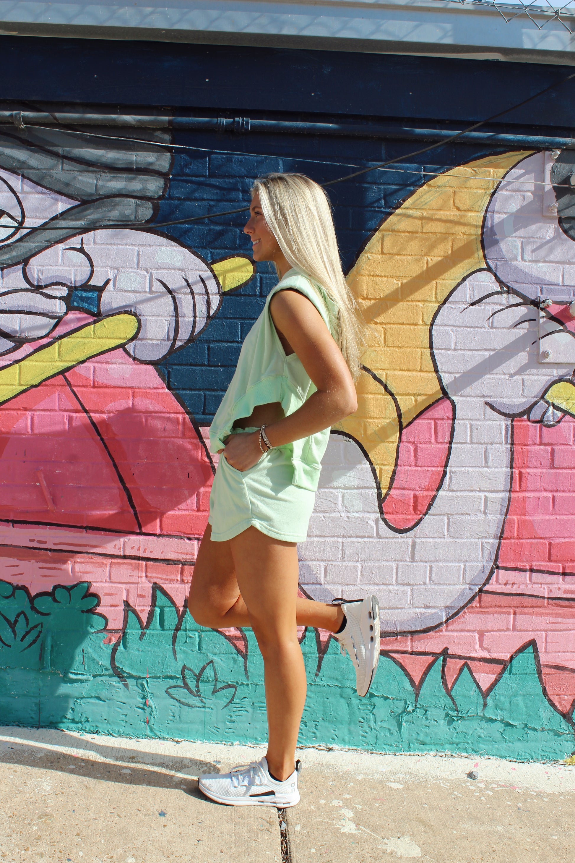 Pair it with the matching shorts for a coordinated and effortlessly cute ensemble that's ready to take on any adventure. Whether you're strolling through the city streets or soaking up the sun on a brunch date, this trendy duo promises comfort without compromising on style.