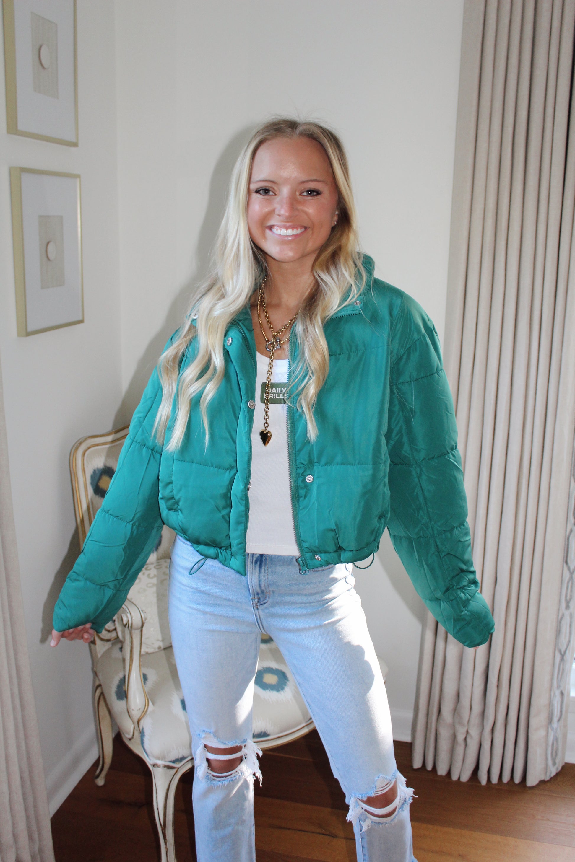 Model is 5'5 wearing a size small! This jacket is perfect for cooler weather. It isn't too thick but it isn't too thin!