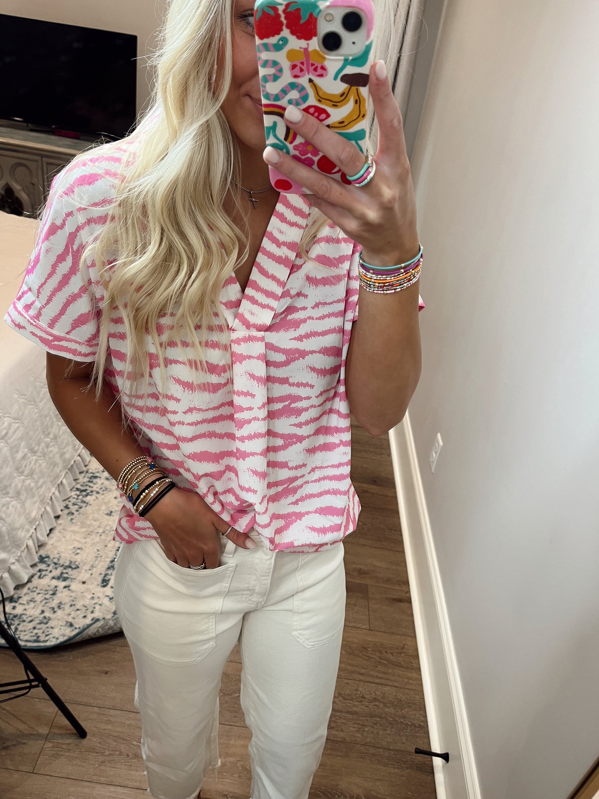 Zebra Striped V-Neck Rolled-up Sleeve Blouse
